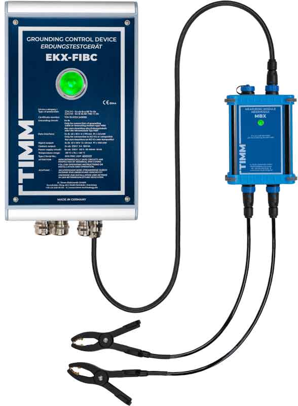 The Grounding Control Device EKX-FIBC provides and monitors a safe grounding connection between the big bag and the designated ground point via two active clamps. The digital measuring technology prevents misuse or bypassing of the device by means of automatic object recognition. A filling release via the electronic control outputs and the highly visible LED indicator is only given if the connected big bag is properly recognized and safely grounded via both clamps. In case of an interruption of the ground connection, the control outputs loek and the optical LED indicator changes from green to red